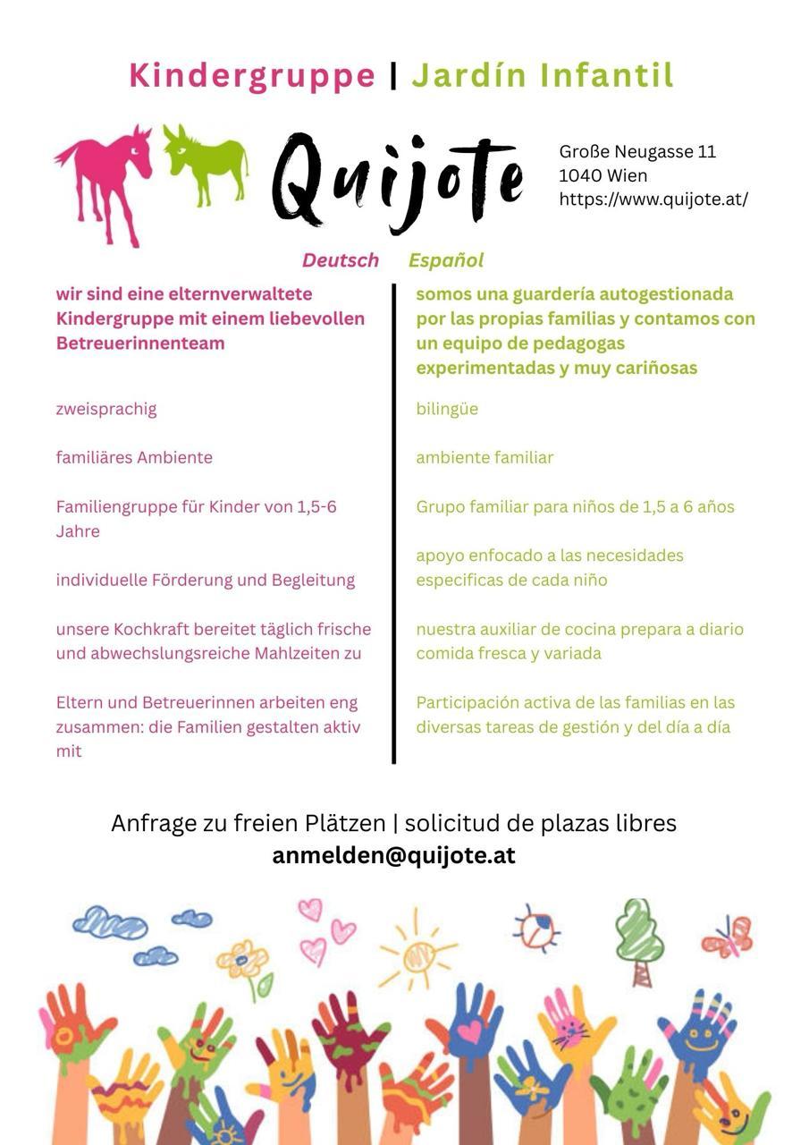 El Quijote es un jardín infantil bilingüe (español-alemán) cuyos maestros tienen el idioma español como idioma materno para 14 niños de 18 meses a 6 años. Se encuentra en el distrito 4 de Viena y los horarios de apertura son de lunes a viernes de 8:00 a 16:00 horas. El Quijote es una asociación de padres y estos participan activamente en la disposición del jardín.